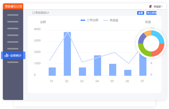 • 业务统计 商品销售订单统计数据全局把握,提供决策支持