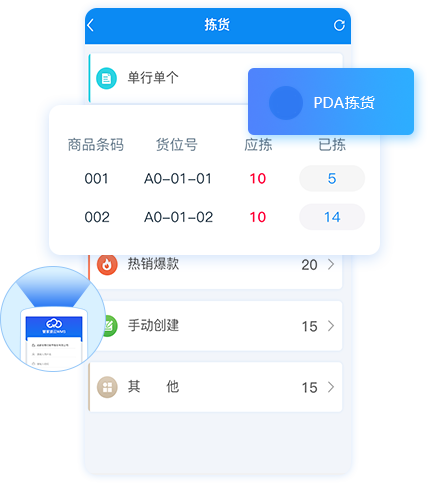 PDA高效拣货;移动验货,称重,发货高效出库;有效管理货位库存;上手快,提高仓库人效